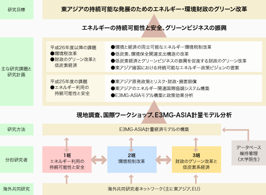 | 平成26年度以降 | ・環境と経済が両立可能な環境税制改革シナリオの提案 ・グリーンテクノロジーとグリーンビジネスの振興を促進する財政のグリーン改革 ・東アジア諸国における持続可能なエネルギー政策ビジョンの提示 |